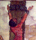It is at this point that Jesus suffers a severe physical beating. (Edwards) During a flogging, a victim was tied to a post, leaving his back entirely exposed. The Romans used a whip, called a flagrum or flagellum which consisted of small pieces of bone and metal attached to a number of leather strands. The number of strikes is not recorded in the gospels. The number of blows in Jewish law was set in Deuteronomy 25:3 at forty, but later reduced to 39 to prevent excessive blows by a counting error. (Holmans). The victim often died from the beating. (39 hits were believed to bring the criminal to "one from death".) Roman law did not put any limits on the number of blows given. (McDowell) During the flogging, the skin was stripped from the back, exposing a bloody mass of muscle and bone ("hamburger " : Metherall). Extreme blood loss occurred from this beating, weakening the victim. perhaps to the point of being unconscious.