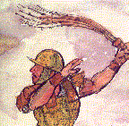 When the cross was erected upright, there was tremendous strain put on the wrists, arms and shoulders, resulting in a dislocation of the shoulder and elbow joints.(Metherall) The arms, being held up and outward, held the rib cage in a fixed end inspiratory position which made it extremely difficult to exhale, and impossible to take a full breath. The victim would only be able to take very shallow breaths.(This may explain why Jesus made very short statements while on the cross). As time passed, the muscles, from the loss of blood, last of oxygen and the fixed position of the body, would undergo severe cramps and spasmodic contractions