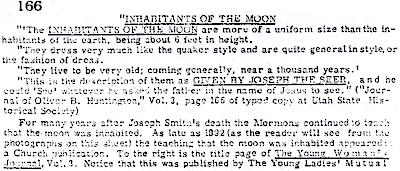 "The inhabitants of the moon are more of a uniform size than the inhabitants of the earth, being about 6 feet in height. They dress very much like the quaker style and are quite general in style, or the fashion of dress. They live to be very old; coming, generally, near a thousand years. This is the description of them as given by Joseph the Seer, and he could 'see' whatever he asked the father in the name of Jesus to see."