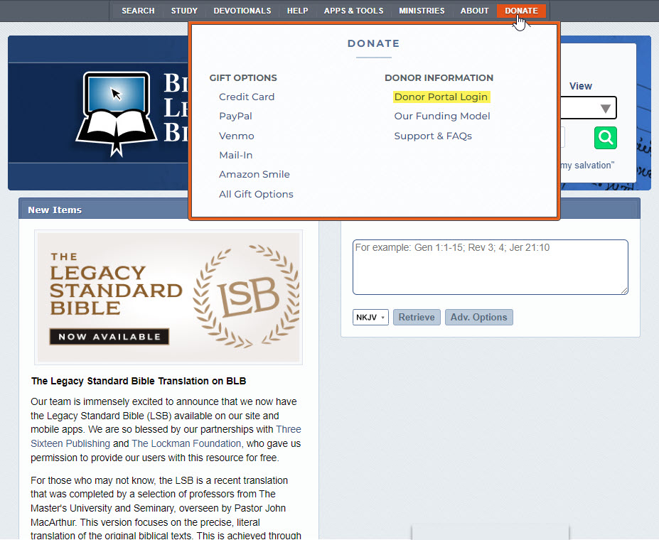 Hover over the "Donate" section on Blue Letter Bible, and click on the "Donor Portal Login" link.