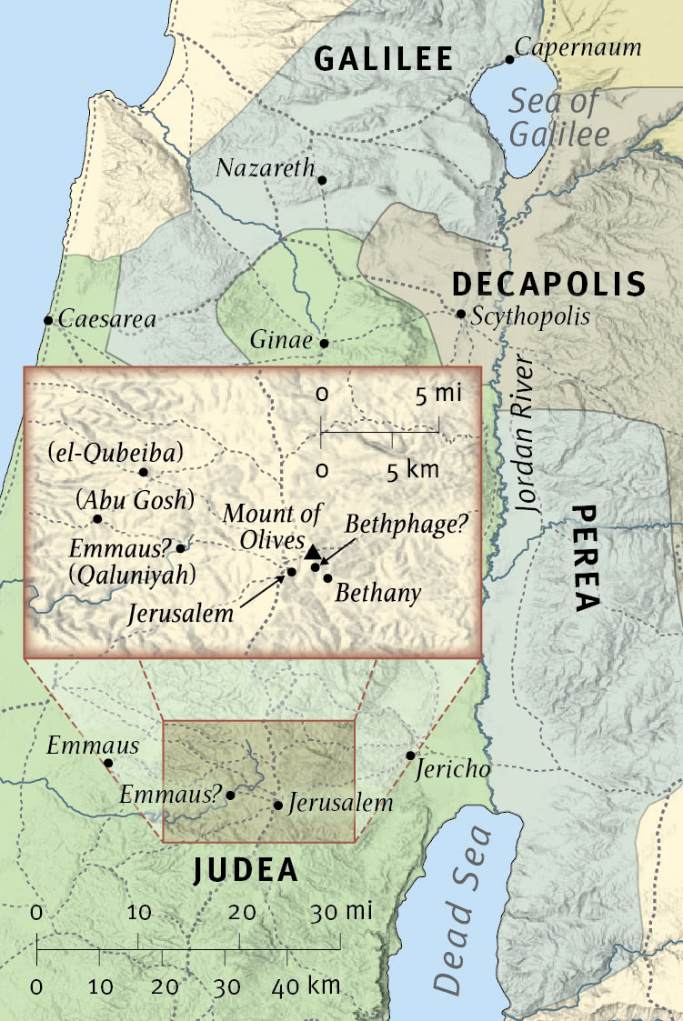 Each of the Gospels and a few other NT books mention various appearances by Jesus after his resurrection, but only Luke notes that Jesus ascended to heaven from the Mount of Olives just outside Jerusalem. Luke also recounts Jesus' discussion with the two disciples on the road to Emmaus (likely modern Qaluniyah, not the Emmaus of the intertestamental period, which lay too far west). Matthew and John note that Jesus also appeared to his disciples in the region of Galilee.