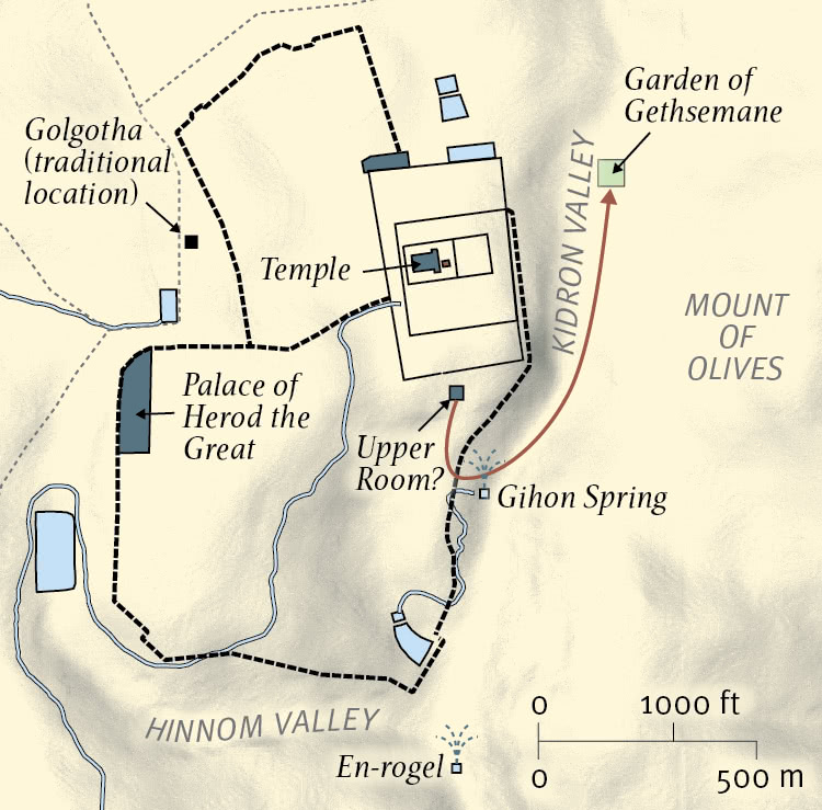 After Jesus and his disciples ate the Passover meal, they crossed the Kidron Valley and entered a garden called Gethsemane (meaning "oil press"), where they often spent time while visiting Jerusalem (see Luke 22:39).