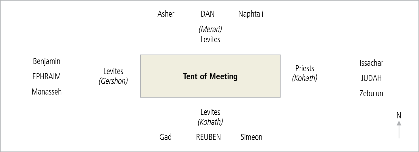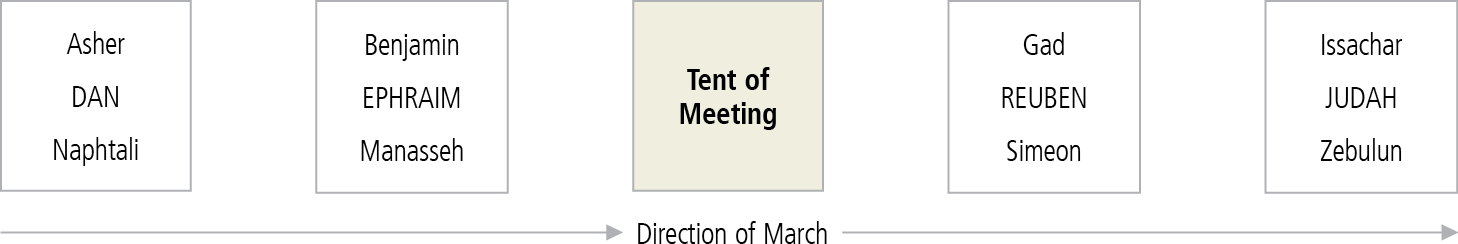 Both in camp and on the march, the tabernacle (guarded by the Levites) is always at the center, as God is at the heart of the nation. The Judah group has pride of place in the camp and leads the nation on the march (capital letters designate the lead tribe in each of the four groups).